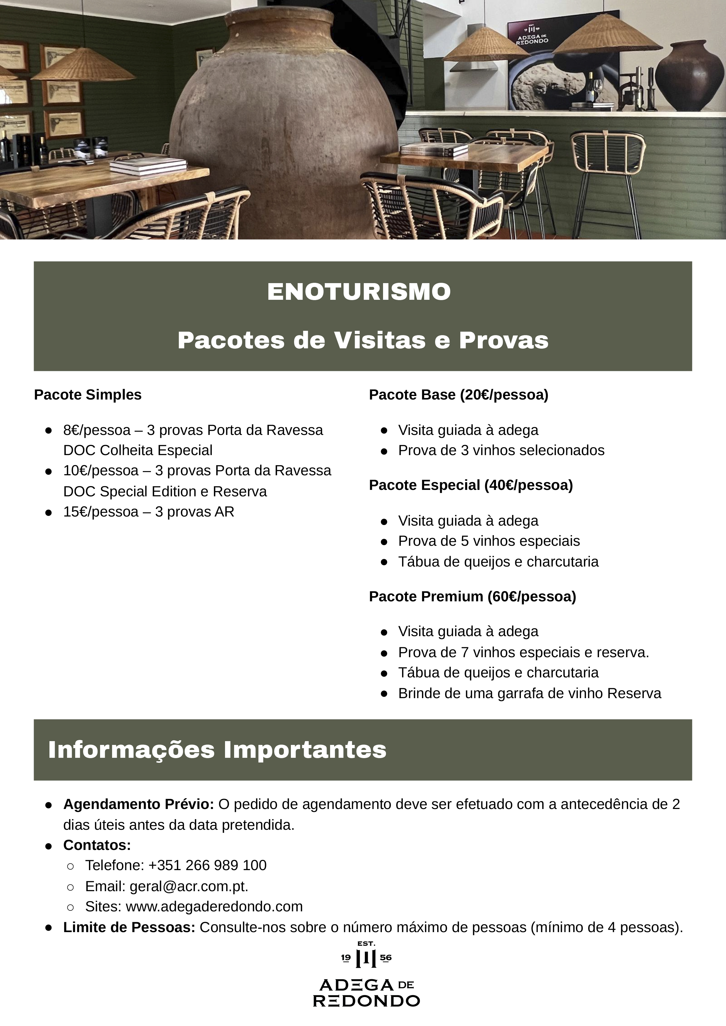 - Visita guiada à Adega, que inclui a zona de vinificação, as linhas de enchimento, o laboratório, a sala de barricas e o armazém de produto acabado.